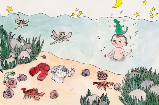 Mamma och pappa väntar på att en baby ska födas från mammas mage. Den lilla pojken bär omkring på ett dinosaurieägg som en dag ska kläckas. Då kommer han att bli vän med dinosaurien. De ska bada tillsammans i de högsta vågorna och aldrig vara rädda. Men det är bara han som vet vad som finns inuti ägget.