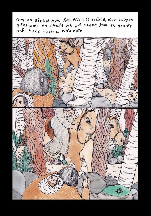 Nobel laureate Selma Lagerlöf’s short story Bortbytingen was first published in 1915 in the short story collection Troll och Människor. The short story was written during the burning First World War as a critique of how people were treated. A long time has passed but the questions are constantly relevant and have been ever since. Equal parts beautiful and scary, this short story is interpreted into an entire graphic novel by Emelie Östergren.
