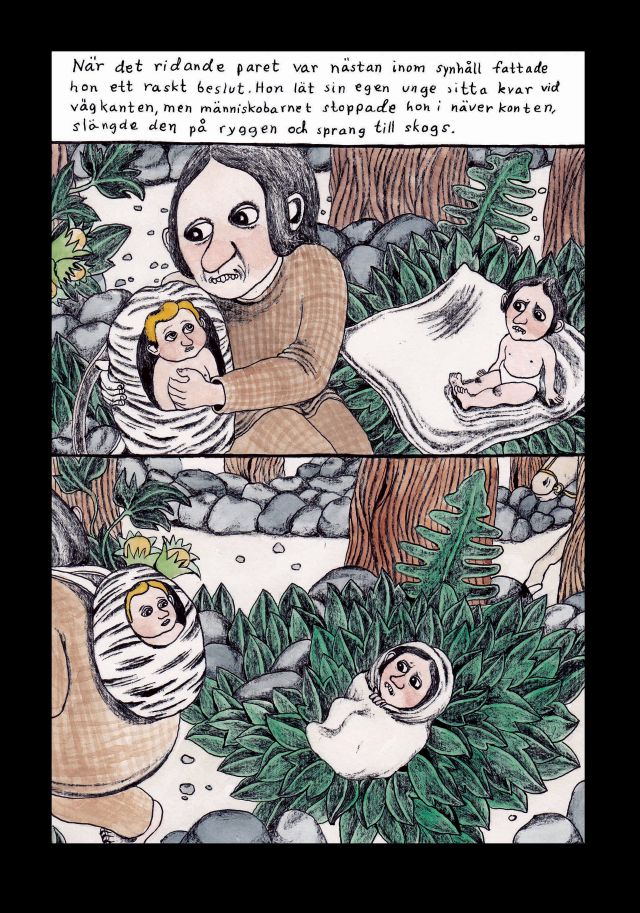 In the forest, the female troll kidnaps a child and leaves her own. The human mother loves and protects the trollchild, despite its “brush to hair and claw on the small fingers”. The love given to this trollchild saves the humanchild who receives the same treatment in the forest. Lagerlöf’s drama is close to 100 years old but is still as current. Who are worthy of care and protection in today’s sociaty?